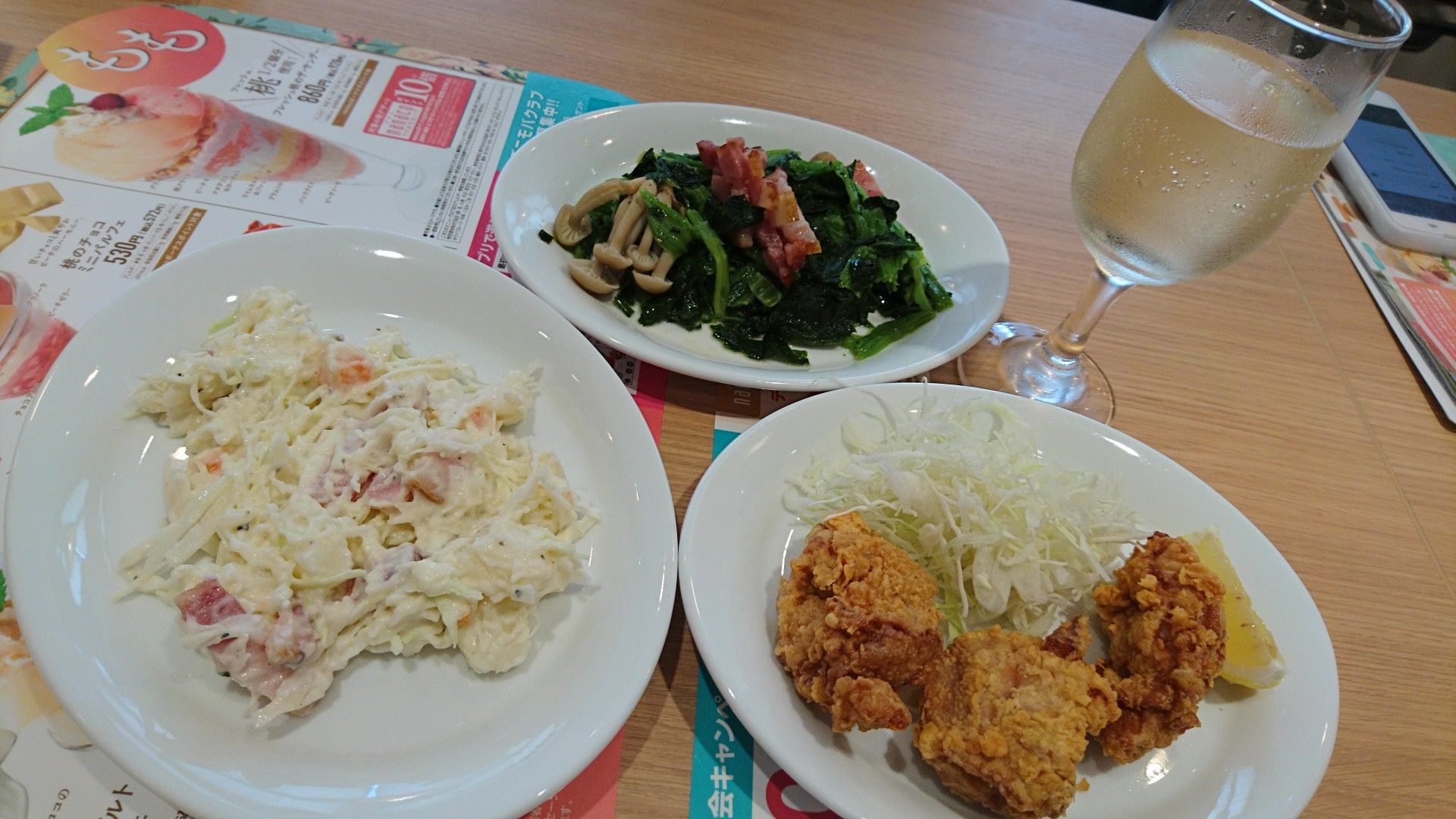 特製ポテトサラダ、ベーコンとほうれん草、鶏の唐揚げ、白のグラスワイン