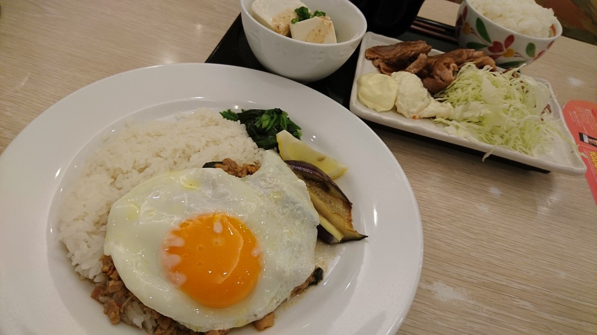 ガパオ・ガイ、生姜焼き膳  この前にソーセージとフライドポテトも食べました