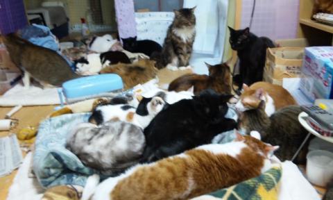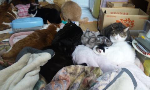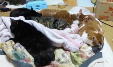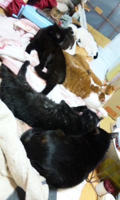これは一部の塊りですが、別の部屋ではもっと大勢でかたまっております(≧ε≦)毛布に3匹以上乗られると毛布を上に引っ張る事ができません寒い~!ので仕方なく人間が丸まって縮こまって寝ております(笑)