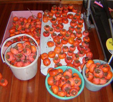 昨日、柿を取りました。妻と二人で半日かかりました。私が木に登って手で取ったり、棒で落としたのを、妻が下でエプロンを広げて拾います。木もかなり大きくて2階の屋根付近まで高さがあります。高い所で、不安定な格好で柿を取るのはかなりの重労働ですよ。しかし、我が家の柿は、売ってるのより甘く評判がいいので、沢山とってみんなに配ります。自分でもがんがん食べるので、当分ビタミンCは一杯ですね。