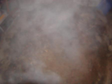 発酵肥料を作っています。初めに麹菌を混ぜて55度くらいまで温度が上昇し、次に1回目の切り返しの時納豆を混ぜました。麹菌より納豆菌のほうが活動温度が高い為、温度が65度まで上昇しました。出来れば70度まで上げたいのですが、ちょっと無理のようですね。45度位に下がってきたので2回目の切り返しました。写真は切り返す前の画像です。蒸気のせいか上手く写真が写りませんでした。白く写っているのが、綿毛状の菌糸体の塊(コロニー)だそうです。これが出来てくると第一段階の糖化作用の終わりです。次にたんぱく質分解作用に入ります。大体の麹菌は死滅して納豆菌が活躍します。PHは大体7前後の中性です。香りはチョコケーキをすっぱくしたような、ビミョウな匂いです。これで温度が下がり始めるとアミノ酸臭が強くなり、そのあと、乳酸菌を加えます。