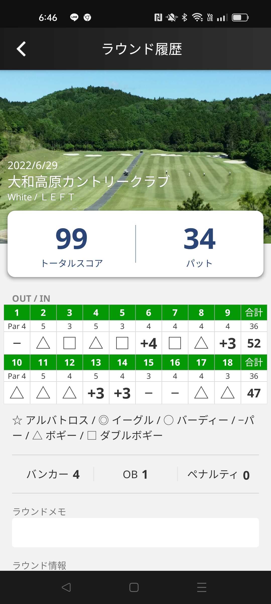 良かった事はドライバーショットが250ヤード超えが出た事と、17番でグリーンオーバーしたラフからピンそば数センチにアプローチが決まった事・そして9番のバンカーで3打消費するもチップインでホールアウト出来たことです。