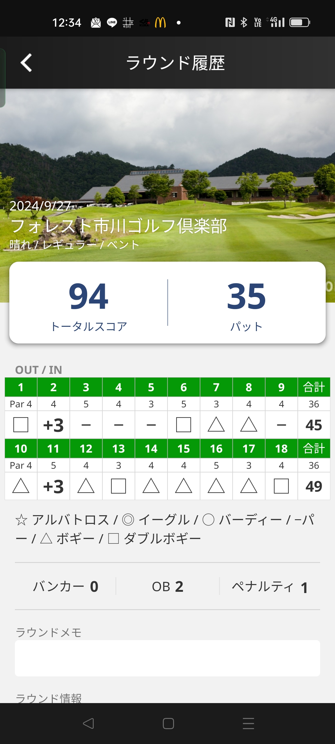 次回(つるやカントリー)もこのようなスコアで上がれることを期待します!