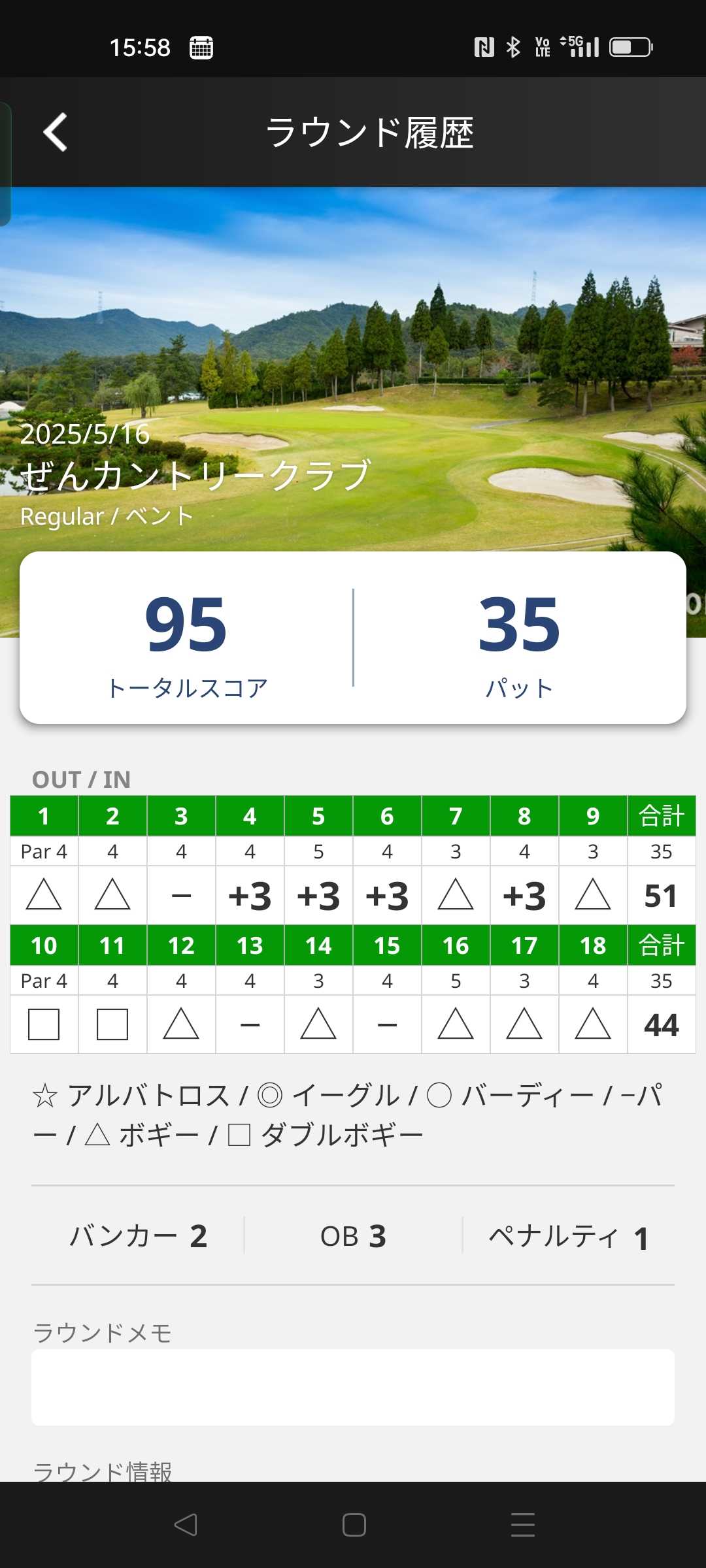 前半はトリプルボギーが多く「50」オーバーしましたが、後半は運もよく久しぶりの100切りをすることができました。