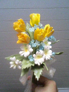 こんばんは。今日は故祖母の作った、ミニブーケを偶然見つけました。とってもかわいい・・・戸棚の奥の花瓶にさしてあったけど、その花瓶が倒れて今まで気付かなかったのです。このブーケ、結婚式に持ちたかったな・・・・・・って、離婚したもんが何言ってるんでしょうwかわいいでしょう^^今は私の部屋にあります。おばあちゃん、もらったよー^^明日で最後の仕事です。それから数ヶ月単位での治療生活に入ります。といっても病気が病気だから、本来の生活ができるように、外に出て行ったり、いろいろしないといけないけど。今は徐々に減らしだしたお薬の、いわゆる『減薬症状』で、めまい、しびれ、頭痛、吐き気がだんだんひどくなってきてます。(抗鬱剤は、少しずつ少しずつ減らしていかないと、反動がえらいことになるんです。副作用がしゃれにならん(--;)私はちょっとハイペースかも?)しかし負けないぞ。明日は生徒にとびきりの笑顔を見せるんだ。そして、一日でも早く、復帰できるように、努力するんだ。