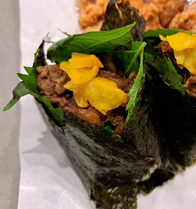 大葉と甘辛な牛肉・漬物がトッピングされているおむすび