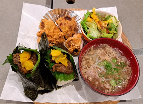 牛肉むすび2個・唐揚げ2個・サラダ・味噌汁・漬物のプレートです。
