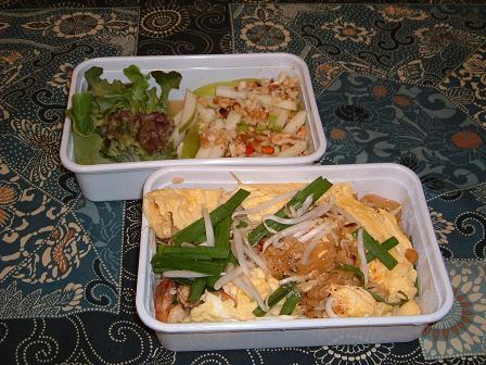 あるタイ料理店のメニューを見ていたら、「パッタイ・ダイエット」という不思議な名前の料理があった。普通は「パッタイ・ガイ」とか「パッタイ・グン」と入っている具が鶏、エビなど何か書かれている。パッタイとは、これもクイッテイアオ「米麺」と、タオフー・ケンという中国の焼き豆腐、干しエビ、塩漬け大根のきざんだもの、ニンニク等、鶏やエビを油で炒め、生のもやし、ニラを加える。砂糖とナムプラーで甘い味付けにしたもの。細かくしたピーナッツたっぷり。薄焼き卵で包んであるところもあれば、一緒に炒めているところもある。油を多く使わないと焦げ付くので油はたっぷり。甘くないとパッタイとは言えない味付けになってしまうので、砂糖もしっかり。そして食べるときに、またナムプラー、砂糖、マナオ(ライム)の絞り汁、粉唐辛子を好みによってかける。料理教室で実際に作ったら、あまりの油の多さに驚いた。それまで小腹が空いたときに食べたりしていたのだが、以後、自粛を決めた。「パッタイ・ダイエット」どんなものが出てくるか注文してみた。麺が入ってない?いや、入っている。細いセンミーという麺が本当に少しだけ・・・。ほとんど、もやしとニラ。エビはけっこう多目に入っている。油も今までに食べたパッタイのなかで、一番控えめ。味付けは・・・砂糖控えめのためかナムプラーの塩分と粉唐辛子がいっぱい!辛い!カプサイシンがいっぱいだから、ダイエットという名前なの?辛いけど、なかなか美味しかった。しかし、口の中が火事状態。・・・中和させるためにアイスクリームを食べてしまった。↓写真の下の料理が「パッタイ」。これは別のお店からtake awayして来たものなので問題の「ダイエット・パッタイ」ではありません。