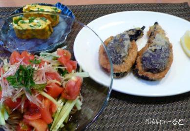 梅雨が明けてから、日中の日差しは強いけれど、カラッとしているので過ごしやすくなりました。主人のいない間は、エアコンかけずに過ごしましたが、彼が帰宅するなり、またエアコンを…。少し前に、お蕎麦屋さんのサイドメニューを習う講習に行きそのときに食べた蕎麦サラダが美味しかったので再現してみました。一見、ぶっかけ蕎麦に見えますが、蕎麦つゆから作ったノン・オイル・ドレッシングかけです。昨日の夕食。茄子はさみ揚げ、蕎麦サラダ、ニラ入り卵焼き。切ったり、混ぜたり、揚げたり、茹でたり…と、することが多く、ボールやザルの洗い物がいっぱいになり揚げ物をするサイドでどんどん、洗っていくこととなり大忙しでした。次は別のものと組み合わせしたいです。これは、その前に独りのときに試作したもの。講習会ではお蕎麦屋さんの蕎麦で作ったので一口食べて「これ、美味しい~♪」と口にするほど美味しくて最高でしたが家では市販の生蕎麦からだったので、蕎麦屋さんのほどの風味は期待できませんでしたが、それでも充分でした。主人は蕎麦一玉分のサラダを食べたのに「これのお替わりは?」と…。基本的なことですが、コツは茹であがった蕎麦を洗って、氷水で〆ることです。ついでに講習会での写真をUPします。これは、講習会での「夏野菜とハモの蕎麦しゃぶ」。蕎麦しゃぶの陰になってしまった蕎麦サラダ。蕎麦がきと蕎麦せんべい。