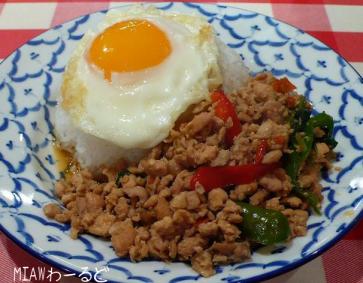 連日、暑いです。4日連続、都心に行ってました。昨日は光化学スモッグが出ていたようでした。今日は飯田橋の東京ボランティアセンターというところで半日、活動。ボランティアセンターの入っている建物の低層階がラムラという商業施設でその中に「ティーヌン」というタイ料理屋があります。「ティーヌン」は直営店だけでも10何店、FC店もいっぱいあるようです。ふだん、同行者がいるとタイ料理屋になかなか入れませんが今日は午前中だけで現地解散したので、1人で食事しました。ガイ・パット・ガパオ・ラー・カオ日本語に訳しますと、鶏肉バジル炒めのせご飯。近々、私はこれを作りたいのですが、味を忘れていたので思い出すために…。日本のは、タイより量が多めです。注文するときに、タイ人の店員さんに「ガイ・パット・ガパオ、カ」と思わず、カをつけて言ってしまいました。