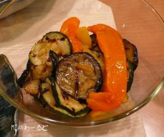 まずは昨日の夕食です。先日のイタリア料理教室で作った野菜マリネ。おととい仕込み、一晩寝かせて食べました。焼きホタテ。このホタテは2つ148円の特売品でしたが、夜、調理するときにもまだ生きていました。魚のグリルにしたかったのですが、いい魚がなかったのでスルメイカをオリーブオイル、にんにく、白ワインで炒めました。ホタテもイカも洋風の味付けにしましたが、少しだけお醤油をたらしたらいっそう、美味しくなりました。ほかに、自家製茄子のぬか漬け。ご飯のおかずというより、酒の肴のようなものを作ってしまいましたが依然、禁酒中の主人です。昨日は、主人が早く帰れそうな感じだったので、このような食事にしたのですが、実際、仕事が入って遅くなって、22時過ぎになってしまい消化の悪い食事になってしまいました。そして、次は残りものランチ。冷たいカッペリーニに昨日の野菜マリネを使いました。サラダのように、さっぱりしていていくらでも食べてしまいそうでした。パプリカが苦手な方はダメでしょうけど。今日は一日曇りという予報でしたが、晴れてきたので、お布団も干せました。