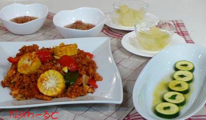 お料理教室でこんなのを作りました。ジャンバラヤ。アメリカのニューオーリンズあたりで生まれた料理。スペインのパエリヤが起源らしいです。パエリヤはサフラン味だけど、こちらはチリパウダー。パエリヤより、クセがないかもしれません。ただ、年輩の生徒さんたちは、「ご飯に芯がある」とお気に召さないようでした。(笑炊飯器を使用すれば、芯がなくなると思うのですが、パエリヤもジャンバラヤも固めのご飯がいいですね。