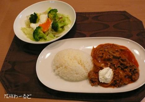 昨夜の私の独り夕食です。冷凍庫に牛肉細切れがありましたので、「なんちゃってビーフストロガノフ」にしてみました。玉ねぎと牛肉だけですが、トマトピューレ、赤ワインで煮込みブイヨンで味付けしました。マッシュルームがなかったのですが、あとで考えたら「しめじ」があったのでしめじを入れてしまえばよかったです。サワークリームは、残りがちょうどありました。これを混ぜて食べます。サワークリームが入っていないとビーフストロガノフとは違う味になってしまうと思います。バターライスも、冷凍のご飯をチンして、バターをほんの少し混ぜただけです。温野菜サラダ。キャベツ消費のために作りました。温泉玉子をとろりと…。ちょっと白身が固くなりました。玉ねぎドレッシングでいただきました。