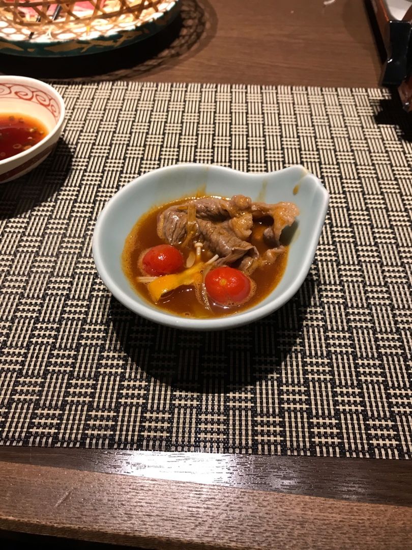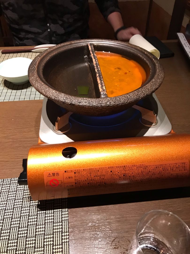 鍋は2つに分かれ、温泉の湯と、トマトスープ。