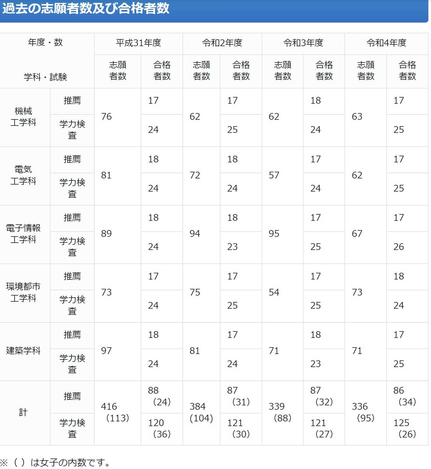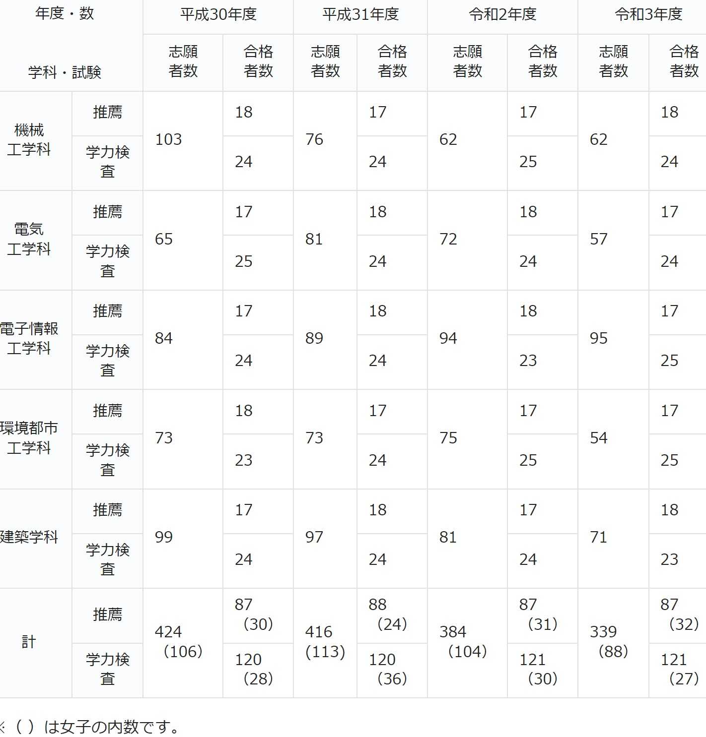 石川高専倍率学科ごとの志願者数( )は推薦時