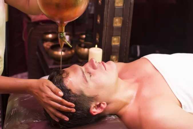 やさしいミドルエイジ女性施術師さん二人のきめ細やかな手技によるアビヤンガ、シロダーラ、スウェーダナとこなし、いよいよ一発目の浣腸ニールハバスティを注入される。