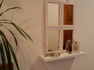 木工。。。というほどでもないのですが、ず~っと前に本で見かけて作ってみたいな~と思っていた飾り窓風の飾棚。100均の木製フレームミラーを4個組み合わせ、家にあった端材をくっつけただけです♪材料だけ購入して手つかずだったはしごもやっと仕上げました♪桟を渡すだけだから簡単だろう♪なんて思っていたのですが、安易な考えでした。。。なかなかまっずぐにならずに、ねじれたり、ゆがんだりσ(^_^;)アセアセ...足の角度も取り付けも何度もやり直してやっと仕上がりました。色合いもなかなか良い感じで、苦労したかいあったかな(*^^)vついでにこちらの扉も制作♪以前作ったトリートメントルームとリビングを仕切る壁に取り付けた3段ボックス。サロンと反対側には子供たちの着替えやおもちゃ、本などを入れていますが、ごちゃつきがずっと気になっていて隠したかったんです♪トリートメントが入っていない時、いる時で動かして部屋を仕切るので動かす時に重くなるのがいやで、兆番のねじがぎりぎりとまる薄いベニヤとファカルタ材という軽い集成材で作りました(*^_^*)おまけ♪端材売場で棚によさそうな幅の木材を見つけ、ちょっと荒かったけど、サンダーかけてペンキを塗ったら大丈夫かも♪と作った棚。本当は白くペイントするつもりだったんだけど、出来あがった棚を見かけたRinに取られてピンクに塗られちゃったσ(^_^;)まぁ、木材30円だったからいっかぁ~~(^^)手作り石けんのお店 Latte Angela下記のイベントに参加させていただきます♪素敵雑貨マーケット~ フレンチ&ナチュラルカントリー手作り雑貨 ~2009.6.6(sat)11:30~16:00自由が丘アートフォーラムワンズ
