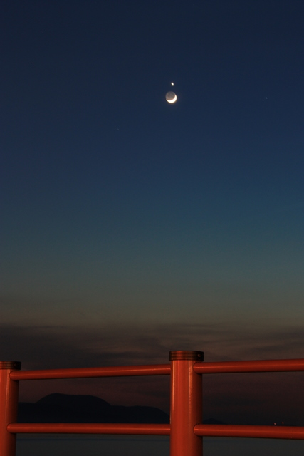 先週の金曜日から、今週の金曜日までの一週間のあいだ夜9時まで残業でした。おかげで体クタクタでございます。明日は日曜日・・・・ゴロゴロするぞぉー!これは先週の16日夜、西の空で輝く宵の明星「金星」の下に、月が寄り添うように大接近したのを撮影してみました。 これってけっこう珍しい現象らしいですね。私は何も知らずに奥さんのリクエストされたので撮っただけなんですが。シャッタースピードを30秒にしてますので、月も金星も微妙に動いてます(汗)来週も工程の遅れの影響もあり夜9時残業になりそうです(汗)仕事なんで仕方ないですが、祖母の面会に行けないのが申し訳ないです。