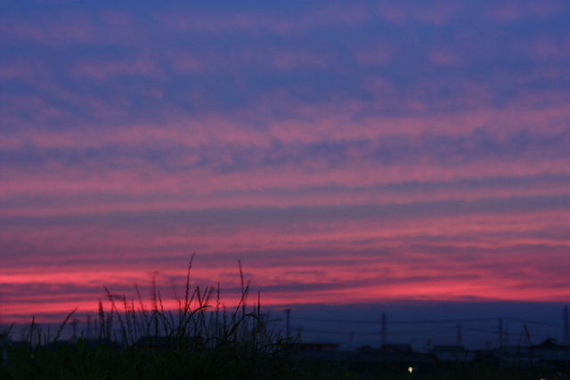 最近、梅雨で本当に嫌になります。元々偏頭痛持ちなのであまりに雨が続くと頭が痛くなるし、雨がふれば仕事中もカッパ着ての仕事になってジメジメするし車の洗車もできないし・・・・とにかく、基本雨が嫌いです。そして、雨だと撮影もできない!と、言いながらなんとか撮影できないものかと車にカメラを乗せて出勤です。撮影日は仕事は定時あがりで、その後ジムにてトレしました。この日は雨こそ降らないものの一日中厚い雲が空を覆っていました。そして、嫁さんにトレ後に「帰るコール」をしながら何気なくバックミラーを見ると雲の隙間をぬってオレンジのような赤のような光芒が・・・嫁さんに「ちょい時間くれ!撮影する!」車を走らせ適当な場所から撮影しました。写真で見ると、雲がないように見えますが実は幾重にも重なった雲に夕焼けが反射している様な感じです。こんな幻想的な風景が見れるなら、曇空も悪くないなと思いながら帰路につきました。