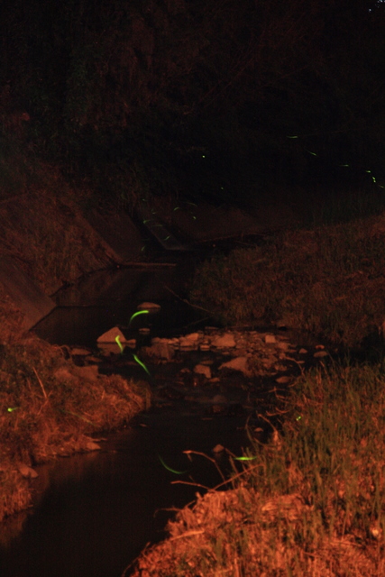 昼間は汗ばむような陽気でも、朝晩は涼しくて過ごしやすい季節です。そして、今の季節と言えば「蛍」です。毎年シーズンになると必ず嫁さんと見に行く蛍。確か去年は家に3匹持って帰って家の前の川に逃がしたのですが、今年家の前の川にフワーっと一匹の蛍が・・・・おぉー!すげぇー!ここに、引越しして初めて家の前の川で蛍見たわーって感じでスッカリ舞い上がった私は勢いに任せて嫁さん連れて車を走らせます。車で走る事 約15分(おいおい!そんなモンで蛍わんさか見れるんかい!)います。います。川の周りを30匹ぐらいがフワフワと気持ちよさそうに飛んでいます。その、幻想的な光景と去年はホントに味気のない写真だったので三脚と一眼をセットして撮影しました。が、しかし!蛍の撮影ってメチャメチャ難しいですよ!まず、周辺にあまりに光がないのでファインダー覗いても真っ暗!どこにレンズが向いているのか非常に解りづらい。そして、光がないって事は被写体を捕捉できないので焦点を勘で合わせるしかない!そして、生き物相手だから動き回る!かと言って動かないとおもしろい写真にならない!通常、夜間の三脚固定での撮影だとノイズ防止の為ISO感度は100程度が適当なのですがあまりに暗いのでノイズが入る覚悟でISO1600まで上げて露出も最大にしました。夜の11時まで頑張って、やっとこんな感じです(汗)うーん・・・・・おもしろいっちゃぁ、おもしろいのだが人魂みたいだ・・・・・(汗)でも、まぁ今年も地元の町で蛍が見れたのでヨシ!かな?