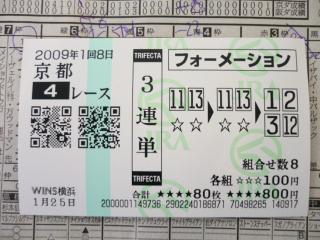 先ほどからの、続きです♪車、出しまーすってか。2000円の予定が、3000円(汗)。初めに、ダーから預かってた駐車場代2000円と、mieの1000円渡す(汗)。mieの残金1000円(汗)。さて、どうしましょうか、14:30。mie「メイン当たるかもしれないし」ダー「その辺停めて、ラジオ聴こう」中山10R・・・ダーが一応予想してたのだけど・・・コレが当たってます(汗)。3連複・6,690円もついてます(涙)。そんなもんです@今年のふたり。ダー「オッズ表、買った買い目のオッズ、東西印付けてみ??」mie「分ったー」ダーが赤ペンで印付けた後、mieが青ボールペンで付ける。・・・結構被ってるのあるな、やはり予想の仕方が似てるんだな。余りつかないなぁーと思いつつ・・・ってか、AJCC。376倍とか、何でふたりで被ってるの(汗)。ダー「5番絡みなら、サンツェッペリンだよ」mie「なるほど・・・」←ふたりでサンツェッペリン買ってる(汗)。パトカーがやたらと回っているので、場所移動。中山11R・・・実は、ちょっと当たりそうな気がしていたwwネヴァブションの軸は固いと思ってたしww馬券も買って、ウインズの近くにいるのに、カーラジオ聞いてるのが可笑しいが(汗)。キングストレイル逃げたwwやったー、そのまま残れーwwmieはラジオで聴く時、目を閉じてレース映像を思い描くことが多い、そしてこの日も。12.3-11.8-12.5-12.2-12.7-12.4-12.0-12.1-11.6-11.7-12.61コーナー 12,5,3,4-2(7,6)(1,9)8,10,13,11 2コーナー 12-5-3-4,2-(7,6)9(1,8)10(13,11) 3コーナー (*12,5)-3,4,2(7,6)9,8(1,10,11)13 4コーナー 12-3(7,5,2)(4,6)9,10(8,11)13-1 かなり、いいかもしれんwwって、何でトウショウシロッコ3着??(涙)。本気でトウショウシロッコとは相性悪いんだ・・・。新潟記念3着、オールカマー3着の時も、両レースウインズにいて、買ってなかった。ウインズに来てトウショウシロッコが出走した時、全部3着で、全部買ってない(汗)。ってか、ダー・・・トウショウシロッコ買ってるのか!?学んだな。なのに・・・2頭軸で買うのにメイショウレガーロ入れるかよ(汗)。ネヴァブションとメイショウレガーロの2頭軸と、ネヴァブションとドリームジャーニーの2頭軸。↓両方ともダーの馬券。京都11R・・・平安ステークスは、全く自信がないので、もう絶望的だ。mie「ダークメッセージ、3着までは固いと思うんだけどなぁ」ダー「お前、軸ダークメッセージかよ!?」mie「そうだよ」ダー「被った・・・ネイキッドにすれば良かった・・・」・・・何か、本当に絶望的(汗)。ふたりで当たるか、ふたりで玉砕するかしかない。ダークメッセージは、哲ちゃんがエスポワールシチーを選んで、川田くんテン乗りが心配。12.3-11.2-12.4-12.8-13.0-12.7-12.5-11.7-11.81コーナー 3,6(2,16)(13,14)(10,11)(4,7,15)12,1,8-9,5 2コーナー 3-6,2,16(10,13,14)(7,11,15)-(4,12)-1,8-9,5 3コーナー 3,6(2,16)(10,13,14,15)(7,11)(4,1,12)8(9,5) 4コーナー 3(2,6)16(10,15)13(1,14)(7,11)12(4,9,5)8 はい、ダークメッセージ、7着で終了(汗)。↓ダーの馬券。帰途に着きます(汗)。明るい内に帰ると、西日が凄いなぁ、眩しい、光に弱いmieは(ダーも弱い)、半寝(汗)。ダー「寝てていいよ」mie「悪いし・・・」←でも半寝。うとうとしながら、気付くと今年初の富士山が観えて、結構感動。あぁ、これから運が開けてくるかもしれない・・・。って、ふたりして、大寒に水飲んだのに、この結果(汗)。mieが残金1Kあったので、ダーに何が食べたいか聞く、悪いが安いもので。ダー「すき家の牛丼」mie「いくらだっけ??」ダー「300円くらいじゃね??」mie「前、安くなってた時、299円だったのに、そんな訳ないだろっ!!1円引きかいっ!!」ダー「あははー、豚丼」mie「分った」ダー「・・・出来れば大盛り」結局、ダーを車に残し、ふたり分の豚丼を買いに、ダーは大盛りにしてあげるよ。さて、いつものmieの近所に停めて、豚丼を食べて(うまーww)、暫しお喋り。って、本当に暫しで、爆睡(汗)。18:30に、ダーに叩き起こされる(汗)。mie「いつもより、早いじゃんよー、もうちょっとー」ダー「今日、仕事片付けないといけないんだよっ!!」そうか、明日は新年会だったね、伊勢海老だったねっ!!←ウラヤマシイ。去年の新年会は、mieの地元でやったので、2次会抜け出して、会いに来た。だって、横浜じゃなく、mieの地元でやった理由が、メイドカフェで2次会やりたいと言う、会社の方々の意見(汗)。そのメイドカフェは、その後、潰れましたけどね(涙)。と言うことで、ダーは会社へ、mieは家へ。でー・・・。帰宅後、直ぐに、爆睡再び(汗)。翌日、何となく体調が悪く、ブログ更新遅れてます・・・。★AJCC、ネヴァブションが重賞2勝目。 25日、中山競馬場で行われた第50回AJCC(4歳上、GII・芝2200m)は、横山典弘騎手騎乗の4番人気ネヴァブション(牡6、美浦・伊藤正徳厩舎)が、道中は3番手を追走。直線半ばで抜け出すと、2番人気エアシェイディに2.1/2馬身差をつけて快勝した。勝ちタイムは2分13秒9(良)。さらにクビ差の3着には7番人気トウショウシロッコが入った。1番人気のドリームジャーニーは後方追走から伸びず、8着に敗
