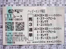 続きー♪前のブログは、こちら。川崎11R・・・当然のことながら、ダーの資金が尽きたので、1K貸す。会った時から、ダーが自信有り気だったから、でも、アラタカ取消(涙)。まず、左の写真が、ダーが1Kで買った分。そして、右の写真が。mie「オレサマな気がする」ダー「俺もそう思って来た、追加買ってよ(汗)」mie「じゃあ、小銭で買って来て」ダー「やったーww400円もあるww」・・・で、買った分。ゴール前で観てたのだが。・・・で、結果が・・・4→10→3(汗)。山ちゃん、差し過ぎ(汗)。1着スマートアピール(1番人気)@戸崎2着ディーズフェリシア(4番人気)@山崎3着オレサマ(2番人気)@今野 何とっ!!mieが当たったのは、ラブミーチャンの記念単勝馬券だけだーwwあははーwwって、最終が19:40のセミナイターなので。高速を使わず帰ることに、たまにはいいか♪前回工場萌えーwwをするの忘れてしまったのだが、高速じゃないと観えないな。でも、ダー「コレ観せたいと思って」うわーwwめっちゃ綺麗っ!!って感動してて、写真撮ってないけど(汗)。みなとみらいを裏から観たよ、mieがランドマーク勤めの時には、まだなかった道路だよ♪何か、デートっぽくて、楽しかった♪余りにもmieがはしゃぐので、そのままみなとみらいと通り抜け。信号で止まったので、写真撮ってみたww横浜市開港記念会館♪ 高速代が浮いたので、それと、溜まったポイント使って。反省会in居酒屋。実は・・・今日の競馬で・・・。ダーのおじ様が、馬主と判明(汗)。レース中、馬柱の馬主名観てて。ダー「mie・・・コレ、おじさんかもしれない」mie「はぁ!?」ダー「後で電話してみよう・・・」でー、留守電入れておいたらしいんですよ。それが、居酒屋で不在着信に気付きまして、電話したら。・・・やはり、おじさんでした(汗)。ダー「今日、川崎競馬場行ってたんだよー、あの馬強いじゃん、勝ったじゃんっ!!」・・・そうなの、優勝したのよ・・・。ダー「えぇーっ!?来賓室にいたの!?」トラックマンさんや、中央の馬主さん(ダーと仲良し)も一緒に、来賓室にいたらしい。しかも、隣の部屋がコパさんの部屋だったので、行き来してたらしい。うわー、知ってれば行ったのに(涙)。でー、後日ネットで調べてみたら。おじさん、なかなかいい馬持ってるじゃないか(汗)。何で今までダーが気付かなかったのか、不思議なんですけど、あのお馬もですか(汗)。しかも、中央登録もしてるじゃないか、あの馬もか(汗)。まだ馬主歴は長くないようだけど、知っているお馬がたくさんいた・・・。ダーにも教えなくては。あぁ、行きたかった全日本2歳優駿に行くことが出来て、本当に良かったよっ!!ラブミーチャンの強さに、帰りの車内では、感慨深い気持ちでいっぱい。馬場の恩恵もあったけど、強い快速馬だと思う。この3頭で、この配当、完全に人気の盲点だったとしか言い様がないが。東京ダービーの時の人気の盲点を生かせない、同じ買い方(汗)。コパさんが「ドバイか桜花賞」とか言ってたけど、ドバイ行くのかなぁ??そうそう。オノユウが川崎競馬の池田厩舎に。クラキンコが大井競馬の中村護厩舎に。それぞれ移籍しました、ダーに聞いたよ♪えっ!?ポシビリテも川崎競馬の河津厩舎(ダーのお友達)に移籍だそうです。詳細は、南関魂。トナカイ&サンタの誘導馬の写真や。ハクホウクン、ハクバノデンセツ、ハクバノイデンシ、白毛3頭親子の写真も。この白毛親子の写真を居酒屋にて携帯で観た時は、余りの可愛さに頬が緩みました♪ハクバノイデンシには、今年1/3に、川崎競馬場で会いました、引退してたのですね。さて。スピードくじが当たらなかったので、スポニチの懸賞の方で、応募するか。川崎競馬オリジナルネックストラップ@葉書で応募♪今年のNAR年度代表馬は、東京大賞典の結果待ちかな??12/23は、もしかしたら、凄いハードスケジュールになるかもです(汗)。ダーが、お仕事抜け出せたらね。★ラブミーチャン、無傷の5連勝でGI制覇/全日本2歳優駿。 16日、川崎競馬場で行われた第60回全日本2歳優駿(2歳、交流GI・ダート1600m、1着賞金3500万円)は、濱口楠彦騎手騎乗の2番人気ラブミーチャン(笠松)が、スタート直後から先手を奪うと直線に入ってもリードを保ち、7番人気ブンブイチドウ(北海道)に1.1/2馬身差をつけて快勝した。勝ちタイムは1分40秒0(重)。さらにアタマ差の3着には5番人気アースサウンド(JRA)が入った。1番人気ビッグバンは7着。 勝ったラブミーチャンは、デビュー戦(笠松)、ジュニアクラウン(笠松)を圧勝後、中央の2歳500万下(京都・ダート1200m)をレコード勝ちし、前走の兵庫ジュニアグランプリ(交流GII)も逃げて快勝。今回の勝利でデビュー以来無傷の5連勝となった。【濱口騎手のコメント】「いやぁ、ミーチャンはすごい馬です。速くて強くてって感じでした。今日は今までで一番良いスタートが切れましたね。よく辛抱してくれました。勝負根性もあるみたいで素晴らしい馬です。もっともっと強いラブミーチャンを応援して下