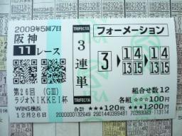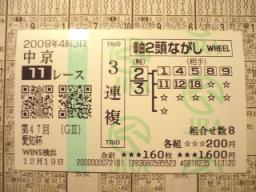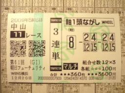 競馬結果・有馬記念・尾張ステークス2009ファイナルステークス・他inウインズv(≧∇≦)v6:53、ダーから電話。2:30頃寝付いたが、珍しく電話鳴るまでキッチリ寝た、いざウインズっ!!一応、購入したか否かに拘らず、昨日のブログで予想した分の結果。実際の買い目は、ちょっと違います・・・。ってか、有馬記念、ふたりして3連単的中してますww★有馬記念・1着ドリームジャーニー、2着ブエナビスタ、3着エアシェイディ、4着フォゲッタブル、5着マイネルキッツ★ダー★予想・1着ドリームジャーニー、2着ブエナビスタ、5着マイネルキッツ、6着セイウンワンダー、11着ミヤビランベリ、15着アンライバルド。★尾張ステークス・1着ヘッドライナー、2着アポロフェニックス、3着ケイアイアストン、4着アポロドルチェ、5着ファルカタリア★ダー★予想・3着ケイアイアストン、8着ヘイローフジ、9着オースミダイドウ、10着メジロシリング、12着カツヨトワイニング。★2009ファイナルステークス・1着エーシンフォワード、2着フィフスペトル、3着ヤマニンエマイユ、4着アップドラフト、5着キャプテンベガ★ダー★予想・1着エーシンフォワード、4着アップドラフト、5着キャプテンベガ、6着タマモナイスプレイ、8着リザーブカード。★的中・中山1R・1着、2着、3着、4着、7着(3連複2番人気・7.2倍・2頭軸流し300円ずつ)←プラス960円。★ハズレ・中山2R・1着、2着、4着、7着、9着、12着★ハズレ・中山3R・1着、2着、4着、5着、6着、12着★ハズレ・阪神4R・1着、3着、4着、12着、落馬中止★的中・中山10R・1着、2着、3着、5着、6着、7着(3連単27番人気・188.9倍・フォーメーション100円ずつ24点)←プラス15,890円。★ハズレ・中京12R・3着、8着、9着、10着、15着★投資8,200円・回収2,460円=プラス12,850円★★ダーはプラス25,000円くらい??★車内。翌日の新聞のトップになりそうなコピーを考えつつ。「イコピコ、頂上」←イコピコの意味が頂上。「リーチ、頂上」もあるか。ウインズへ歩いてる最中、ダーのお仕事仲間から電話。どうやら、枠連1-5、5万1点買いしたらしい。金杯の出目が、そのままと言うのがデータらしい。mieは、JCの払い戻し、ダーは昨日の払い戻し。★土曜阪神11R・ダー・3連単・19番人気・70.4倍×200円=14,080円↓★土曜阪神11R・ダー・3連複・7番人気・21.9倍×500円=10,950円↓ ★土曜中山11R・ダー・3連複・4番人気・26.5倍×200円=5,300円↓ 中山1R・・・3連単フォーメーション6点でマークシート塗るも。3連複2頭軸で確実に、と思ったら、3連単でも当たってた(汗)。バラ買いした、3連単は、1着、2着、4着。1着ミエノグレース(1番人気)@武豊2着オクルス(2番人気)@田中勝3着ゴールインマーク(3番人気)@内田博★中山1R・ダー・3連単・2番人気・20.7倍×100円=2,070円↓★中山1R・ダー・3連複・2番人気・7.2倍×500円=3,600円↓ ★中山1R・mie・3連複・2番人気・7.2倍×300円=2,160円↓ 中山2R・・・1着、2着付けに2頭で3連単フォーメーションも、一方が9着の上に、3着買ってない。馬単も、2着、9着。1着アポロノサムライ(2番人気)@勝浦2着セイウンツースキー(1番人気)@内田博3着アサクサマリンバ(10番人気)菊沢中山3R・・・1Rで味をしめて2頭軸流し3連複も、軸4着5着の上に。悩んで買わなかったお馬が3着。1着ローグランド(3番人気)@内田博2着ドリームバスケット(4番人気)@ルメール3着ブーケドロゼブルー(8番人気)@後藤阪神4R・・・軸トキメキヒーロー流しで3連複6点も、サトノスローンが落馬(涙)。ダーに至っては、1点勝負になってしまう(汗)。ふたりして2着抜け。1着ホウライブライアン(3番人気)@出津2着ゴールドリーズン(6番人気)@植野3着トキメキヒーロー(2番人気)@石神ダーは、中京、阪神も午前中のみ買っていて。とんでもない人気薄拾ってるのに、他を買ってなかったり(汗)。予想したけど買わなかったら、高配当だったり。そうゆうのがいくつかあって、凹んでた(涙)。朝通った時、お寿司屋さんが「本日予約のみ」的な看板が出てたのだけど。行ってみたら、やはり常連で一杯になるから出てただけだった(汗)。1番乗りですんなり♪・・・すぐ一杯になる(汗)。ダーは、朝イチで有馬記念も買ったし、少ない残金でちょこちょこ買いに。mieは、難解な有馬記念を、考えてると言うより新聞眺め。結局、素直にサクッと取り合えずマークシート書いて、ダーにフォーメーション点数確認依頼。戻って来たら、24点だと言う。結局その後、その24点と、伝説の新馬戦4頭の馬連ボックスで計3,000円分ダーに依頼。だって、何でエアシェイディ人気ないの??昨年の3着馬だよ??更に後に、尾張ステークスも依頼、人気薄ばかりになったけど。そして、テンイムホウが出走してないのが、淋しい限りだけど(涙)。中山7R・・・写真判定でドキドキwwだってそのお馬、ダーの軸っ!!1着アリゼオ(1番人気)@ルメール2着ミカエルビスティー(3番人気)@勝浦3着セイウンジャガーズ(8番人気)@蛯名★中山7R・ダー・3連複・10番人気・39.4倍×100円=3,940円↓ 中山8R、有馬記念と同じ舞台のグッドラックハンデで、