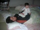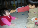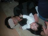 心さんは離乳食を始めてもう1カ月だが~今のところ食べるのが大好きみたい 翔太の時は「口開けて~」ってくらい食欲少な子だったけど・・・心はよく口も開けて欲しがってくれる 兄ちゃんがお菓子を食べさせてくれる ゴロンゴロンと移動するよ~心にお菓子を食べさせようとすると・・・「翔太がする~」と言って、まるで動物の餌やりをしたがる子供のようにやりたがる。ちゃんと口の中のものが無くなったのを確認してから次を入れてたな心は自分の行きたい所にゴロンゴロンしたり向きを変えたりして、移動するのも上手になったでも兄ちゃんのおもちゃが散乱しているので、おもちゃの上に転がったり・・・痛くないのかな~??やっぱり二人目は少々の事じゃ泣かないって聞くけど本当だ~翔太兄ちゃんは・・・と言うと・・・夕方、眠たかったせいかかなりのハイテンションだったトイレ行くのに、全部服を脱いで踊りだしたり・・・暖房つけてるのに~温くしてる意味ないやん こんなバカな事してると、また風邪ひくぞ早く服着なさ~いって写真撮ってる私も私だな