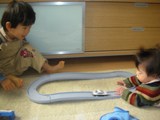 今日は午後から翔太が4月から入園予定の幼稚園の入園説明会だった午後からパパに有休を取ってもらい、二人パパに預けてママだけご近所さんと一緒に幼稚園へ幼稚園は外遊びが主でウワサによると野ザル状態らしいお勉強中心の幼稚園ではないので、翔太もお友達と仲良く楽しい時間が過ごせると良いなただ・・・幼稚園入園までにママには課題が・・・リュック・お弁当箱入れ・座布団・・・etc・・・を手作りしないといけない・・・あ~しかし、うちにはミシンもないし・・・裁縫の基礎から分からない・・・でも愛する翔太の為にどうにかしなければ・・・(^^;家庭科の授業、まじめにやっておくべきだったな家の中では翔太が心にモータートミカを見せてくれるが、心はすぐに破壊してしまう 来た~パトカーだ~!! 食べちゃえ~!! レールも破壊だ~!!最近、心は何でも口に入れて目を離すとティッシュ食べてたりするので、ママが心の口を開けて「もうこんなん食べたらいけんよ~」と言っていたら、翔太はよく見ていたんだろう・・・翔太までも心が何か口に入れると、心の口をグイっと開けて、「ここちゃん、ダメよ~」とか注意していた子供は親のすることをよく見ているんだな・・・