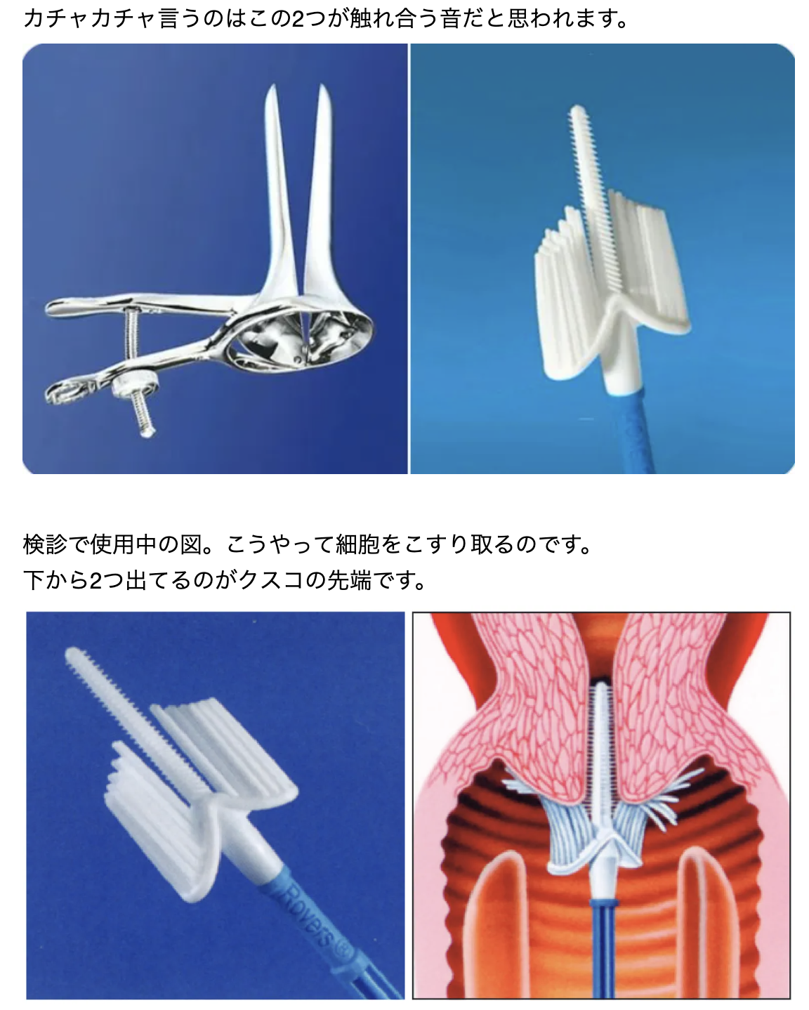 検査用のスカートに着替えて、下着を脱いで、自分の番になったら、診察台に…お腹の辺りがカーテンで仕切られてるので、医師の顔も分からないし、声だけが聞こえて、指示されて、使われてる器具も知らずにグリグリされて、痛いです。必ずナプキンに血が付き、数時間は痛いです。こんな器具だなんて😭 pettyworldのブログより