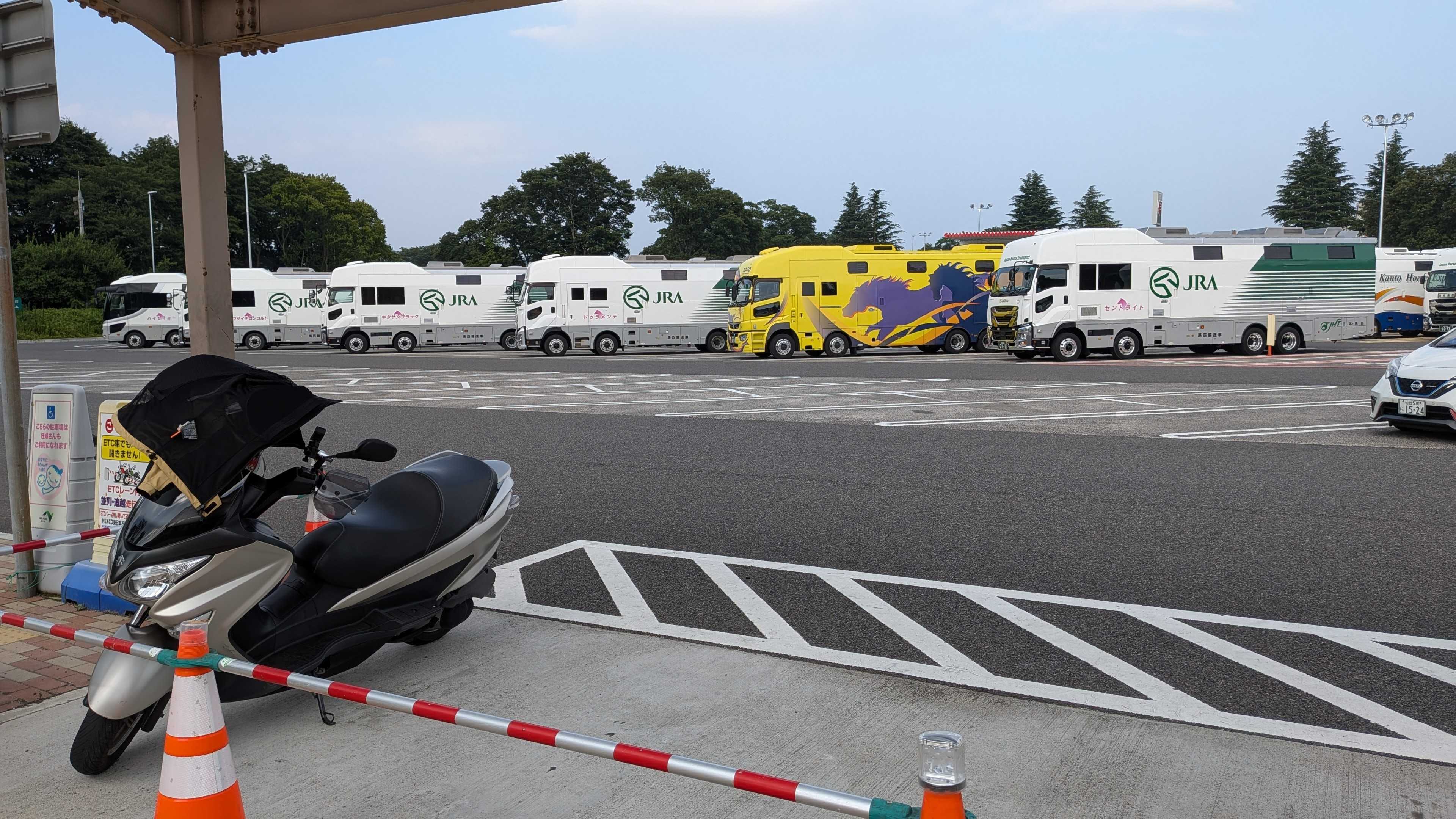 JRAの輸送トラックがいっぱい。福島競馬に迎えに行くところ?