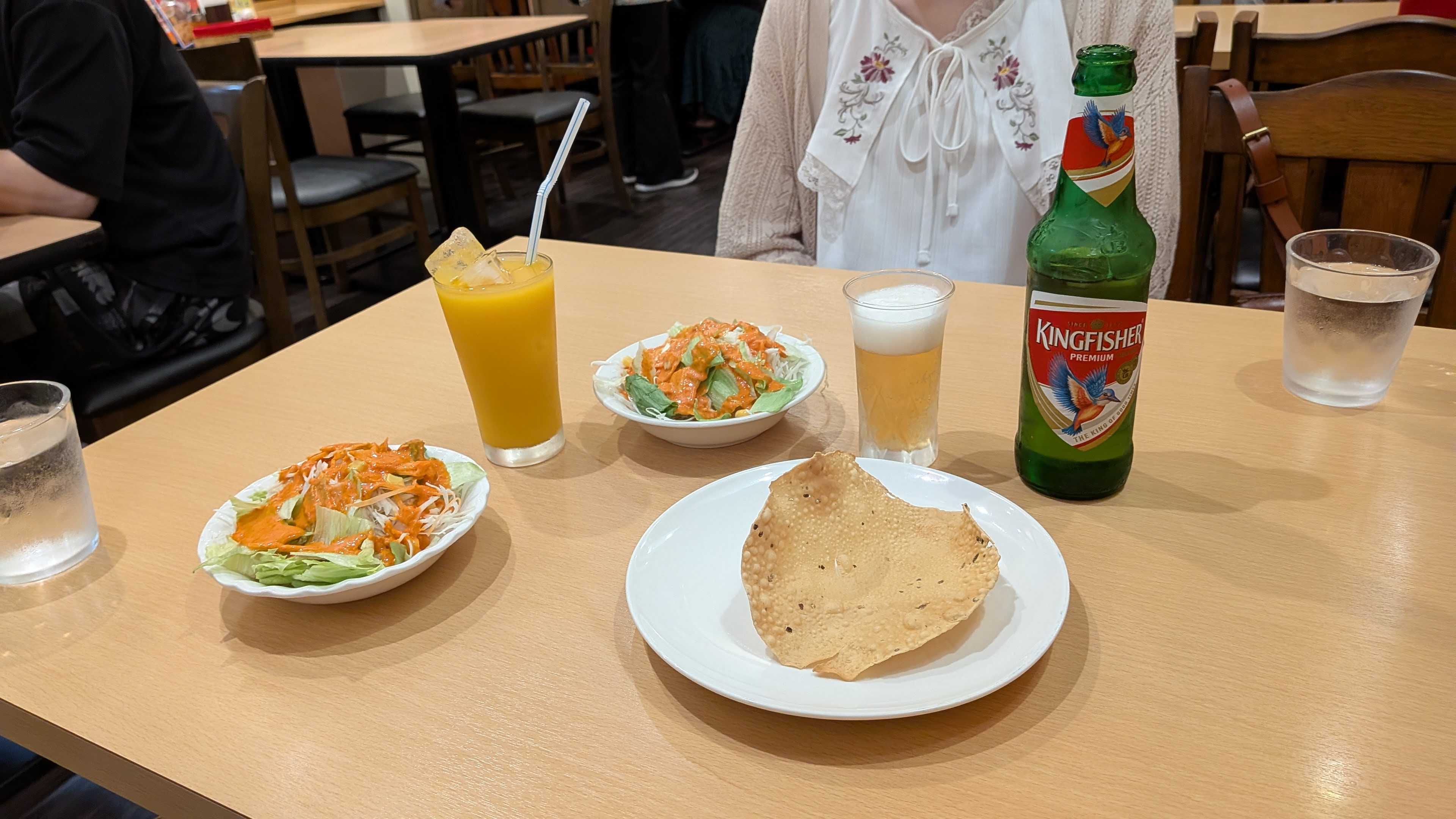 ナンとカレーが来るまでインディアンビールを飲んで待つ。つまみでパパド?が添えられている。店名がネパール語? ネパール人なのかな?