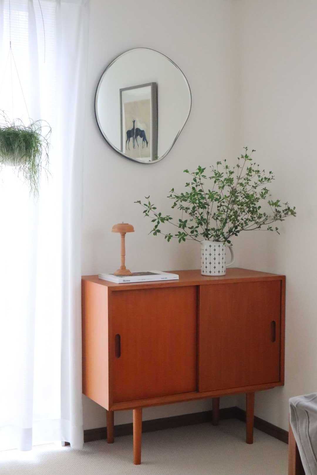 こんにちは今日もこのブログにお越しくださって、ありがとうございます。日中はまだまだ暑いですが、朝夕、本当に涼しくなりましたね。おとちゃんの朝んぽもゆっくり時間に切り替わりましたようやく秋ですね🍂 +++秋は、ファッションもインテリア熱も上がって楽しいですね届いてから随分立ちましたが、スーパーセールで購入したferm LIVINGのPond Mirrorをようやく飾りました。飾りましたと偉そうに書いておりますが、いつものように、夫に丸投げで私は横でガジゴンを食べながら設置場所を指示するのみでございましたが。笑少し前の記事にも書きましたが、設置したかったのはココ。その時の記事にも書きましたが、ナローボードの中にジュエリーボックスを収納しているので、ここにミラーが欲しかったんですよね。フレームレスでアシンメトリーなデザインが、とっっっても素敵♡高級感があるのが分かります。Pond Mirrorは、カラーが2色展開です。わが家が購入したのはダーククロームで、サイドから見るとこんな感じ。もう1色はブラスで、ミラーとブラックフレームの間の細いシルバーのところがブラスカラー・・・という感じ。上手く説明できてませんが、気になる方は商品サイトをご覧ください。私は正直どっちでも良くて、正面から見るとおそらくブラスの方が柔らかい印象なんじゃないかと思います。ダーククロームの方がシャープというかスッキリした印象かな。とってもとっても素敵なミラーで大満足なのですが、飾る位置が少し左に寄ってしまいました。ちゃんと確かめていなかったのですが、アンカーを埋め込む場所に柱が入っていてできなかったんです。本当は壁の真ん中に飾りたかったのですが、これはもう仕方ないです。今はもう見慣れたというのもあるし、そもそもあんまり気にならないタイプなので、ここにミラーを飾れただけでもう大満足ですそれはそうと、ドウダンツツジさんまだ元気なんですけど。笑枝をカットして皮を剥がして・・・を繰り返しているからどんどん短くなってはいるけど、すごい生命力ですよね。それはさておき。ミラーを飾ったので、coricciさんのポスターはシェルフを外して寂しかったこの壁に掛けました。ミラーにも写っていい感じ。リビング全景を撮ってみるとこんな感じ。ミラーを飾ったことでお部屋が広く感じるとよく言うけれど、大きなミラーじゃないからか、それは正直分かりませんでした。ただ、明るく見えるというのは実感としてあります。写真では分かりづらいのですが、例えば曇り空でリビングが暗い日にキッチンからリビングを眺めると右側の窓から入る光がミラーに写って明るく見えました。ちょっと画像にすると分かりにくいですが、実際はもう少し明るく見えています。なので、明るく見える効果はあるみたいです。夜の雰囲気も好きです♡散々悩んで迷ったけど、結果買ってよかったです。ferm LIVING.. #fermliving#北欧インテリア#インテリア#インテリアを楽しむ#暮らしを楽しむ#リビングインテリアパン屋むつか堂さんの博多めんたいフランスパン。半額SALE!!10/1 20:00~再販予定送料無料!ではでは~最後までお付き合いいただき、ありがとうございました。こちらもよろしくお願いします。 ↓ ↓ 随時更新しています! ↓ ↓ブログランキングに参加しています。お手数ですが、こちらをポチっと応援クリックしてくださるととっても励みになります♡ ↓ ↓にほんブログ村