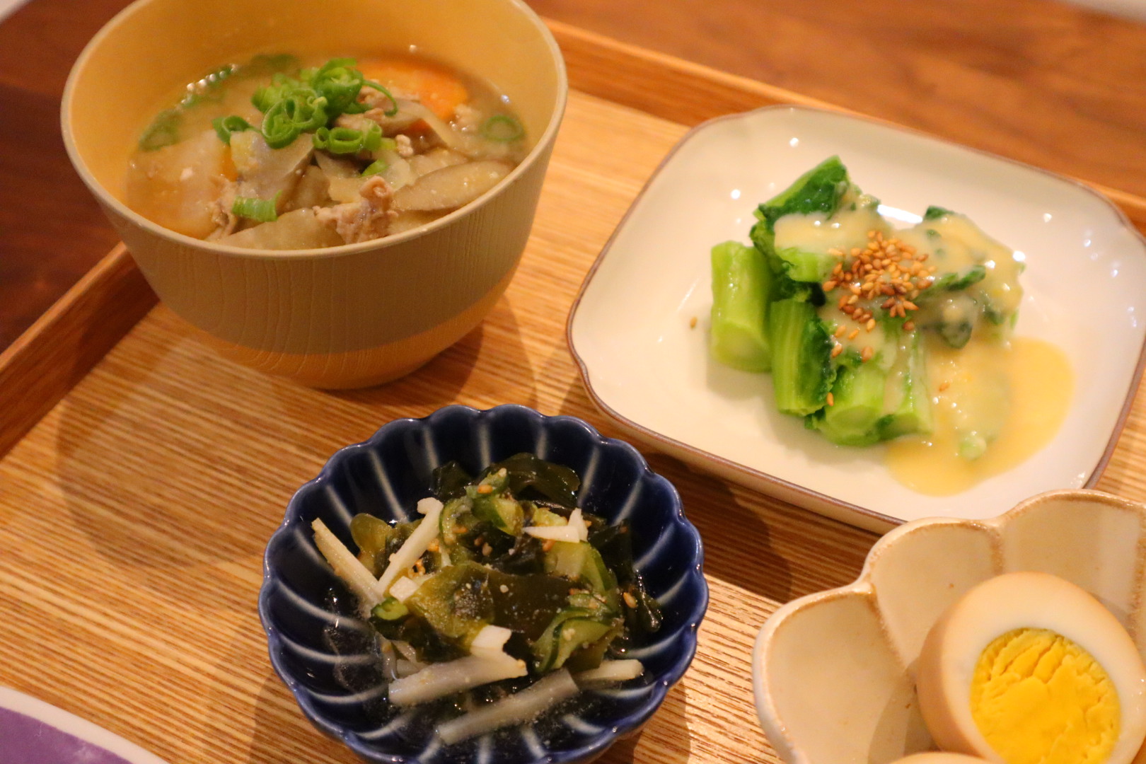 副菜は、ホタテかま・ワカメ・キュウリの