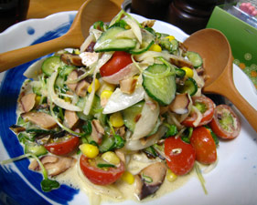 3連休ですが、私たちは式の準備の大詰めの3連休ですと言っても主に大忙しなのは先に帰る旦那さんの方ですが・・・私は昨日の飲み過ぎ食べ過ぎで体重が急上昇してしまったので、忙しいさなかに自分勝手にもスイミングしておりました今日は1kmx3本とその他もろもろで4kmの水泳!最近勢い出て来ちゃって、毎回かなり泳いでます さて、ゆっくり2人で食事が出来るのもしばらくないかもと思い、今日は家でちょっといつもとは違う料理を作っていただきました名付けて、「結婚式壮行会」ドライトマト、さっそく登場ですまずは今年の梅でつけたワインで乾杯 鯖節のサラダ 先日思いがけず好評いただいたサラダの再現です。中身は・・・刻んだ鯖節、塩揉みしたキュウリ、水にさらした薄切りタマネギ、ミニトマト、コーン、かいわれソースはマヨネーズ、レモン汁、わさび、醤油、粗挽き胡椒冷製トマトパスタトマトがどっさりーバゲット先日作ったバゲットを薄くスライスして、おいしいクリームチーズとオリーブペースト、ドライトマトをトッピング! 今日もしっかり食べ過ぎですねでも楽しかったしおいしかった!! ここからラストスパート、最後のからだ作りに励みます