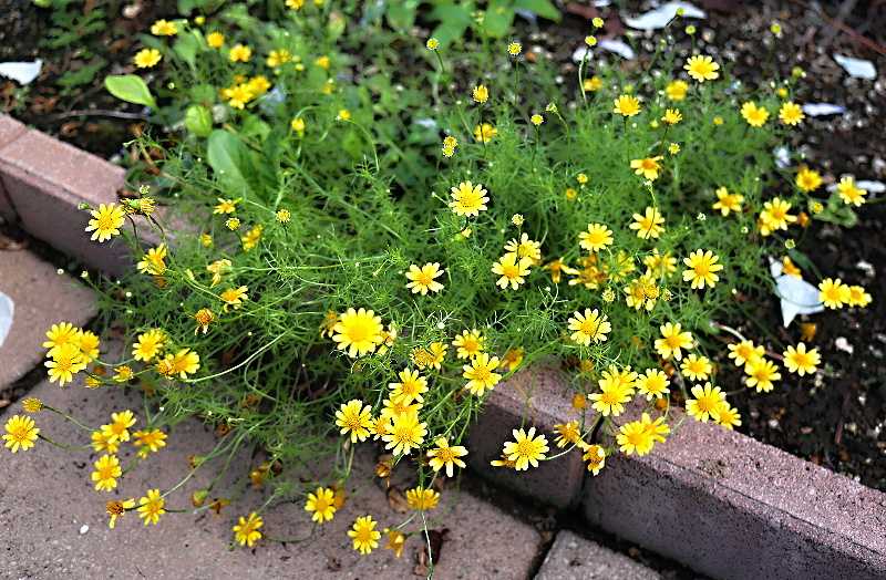 細い羽状の葉に黄花が周年咲き続ける小型の可愛い花半耐寒性で一年草扱いされることもあるが、実生でも生えてくるので、毎年花を見られる。