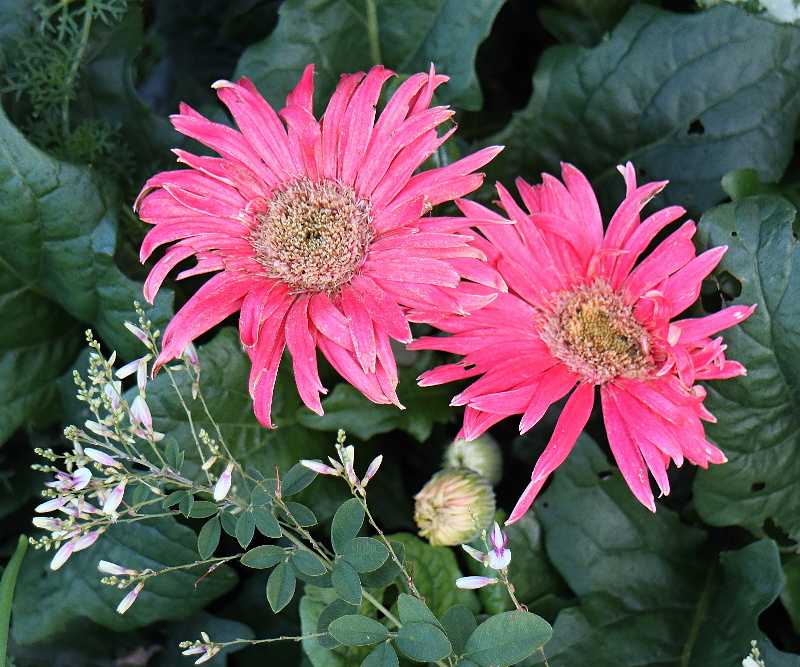 暑い中、次々花をあげてくるガーベラ下の花は、鉢植えの萩・江戸絞り