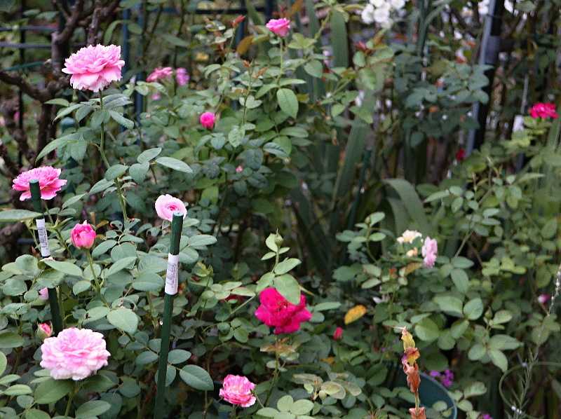 イングリッシュローズのウィリアムモリスステムが細く可憐な感じイングリッシュローズのシスターエレザベスイングリッシュローズのジュピリーセレブレーション開ききって散る寸前のメアリーローズロサオリエンティスのシューラネージュロサオリエンティスのハープシコードデルバールのシャンテロゼミサトつるバラのジャスミーナ