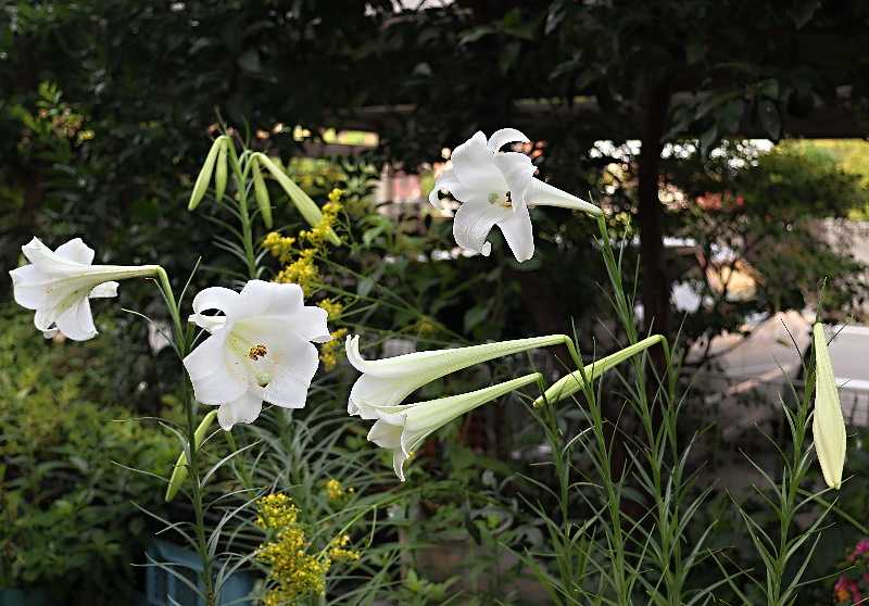タカサゴユリが、背丈以上に伸び風で倒れたので切り取りました。一本に、11個の花が付いています。実生で良く増え、小さく咲くと可愛いですが、これほど大きくなり花の向きがばらばらになると観賞価値が落ちます。バラはロサオリエンティスのモンクールとメイアンのアクアポリスロマンチカデルバールのペッシュボンボンなど