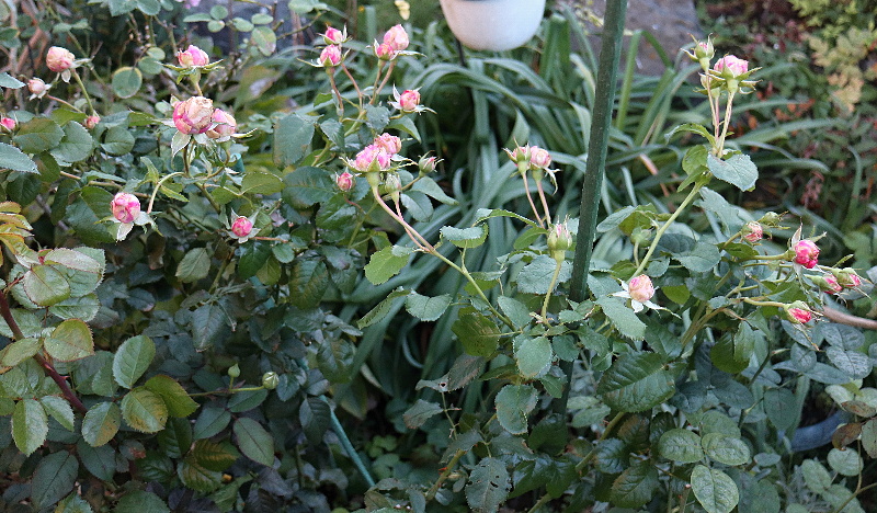 マチルダザダークレディ大輪花が幾つも咲いていて、まだこれから開く一輪シェエラザードロサオリエンティスのプシュケ一輪綺麗に咲きました。冬は濃い色で咲き綺麗。オールドブラッシュ 蕾がまだ沢山付いています。レッドキャスケードデルバールのローズポンパドールアリスターステラグレイ