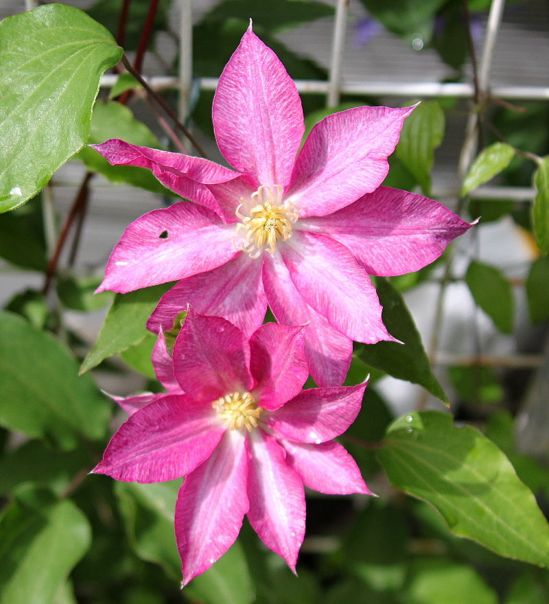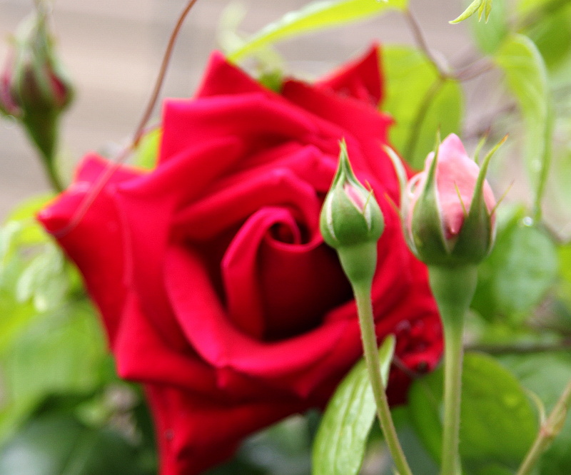 ピンボケに撮れてしまったけれど、剣弁高芯咲きの大型つるバラ一昨年、手に負えないから無くそうと株元から切りましたが、今年は花が咲くようになりました。花形が綺麗で、花持ちも良いバラです。満州黄(クレマチス)が巻きついて邪魔をしています。切ってやろうと思いながら、やることが多くて手が回りません。