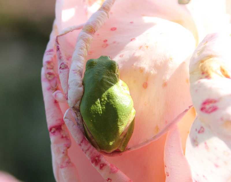 昨日午後3時頃サマーレディの凋花を切ろうとしたら、青蛙が、垂直状態でへばり付いていました。今朝、見たらまだいました。可愛いです。