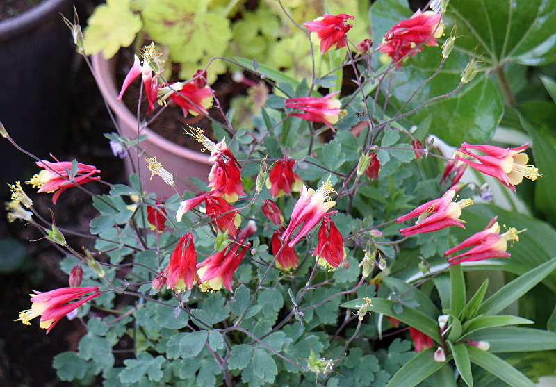 カナダオダマキ・リトルランタン実生で良く増える 下は芽生えた小さな苗に花が付いたので、直径3㎝程の手作りの小さな鉢に植えてみました。ミヤマオダマキ肥料が効いてしまい、野趣が感じられない。山オダマキ実生で良く増える