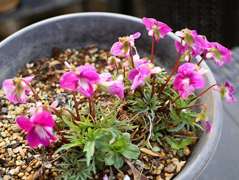 撮影4月9日綺麗な色で咲く「紅寿」上下 肥後スミレ葉が細く、白い花を咲かす。大好きなスミレ薄紅肥後スミレ