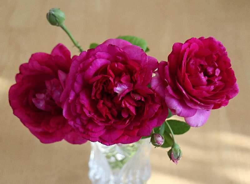 イングリッシュローズのザダークレディが高い所で咲いていたので切りました。大輪で花もちも良く美麗花です。小輪はジャスミーナイングリッシュローズのグラハムトーマスデルバールのビアンブニュなど・・・