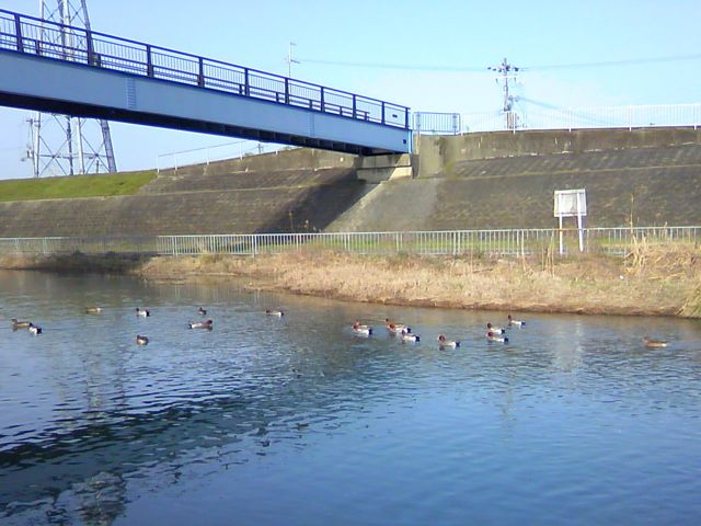 安威川の流れには、 の日差しの下、カモの群れが泳いでいる。