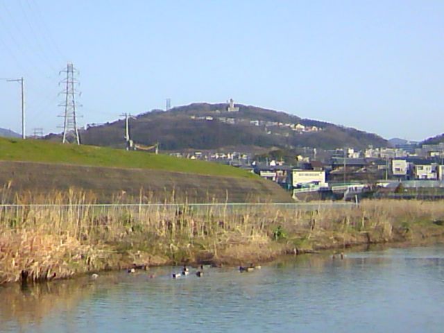 昨日のコース、阿武山をバックにカモの群れ(クリックで拡大)。