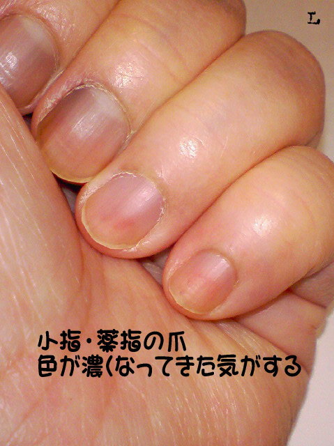 今朝の右手指です写真をクリックすると大きい写真を見られるようにしていますので試してみてください^^ きのう、お風呂を出たら小指の爪の下の皮?がぷっくり膨れていました少し時間が経って見たら 乾燥していたのでコチョコチョしてみたら モロモロ…と崩れて血の壁がはっきり出てきましたピンセットか何かで 血の塊をすすすぅーと抜き取りたい!全然痛みはありません綿手やゴム手を付けるときが一番痛い(?)かも…これも痛いと表現する人も居れば私のように「気色悪い」という程度の人も居ると思います薬指も大分色が悪いですが…確かに抗がん剤で悪化するようです次回からは 左手の小指と薬指も記念写真が必要かも… 枇杷の花が咲き始めました