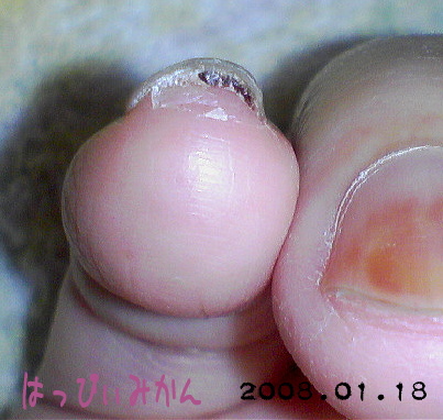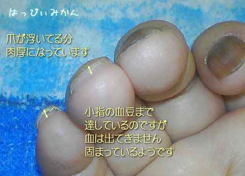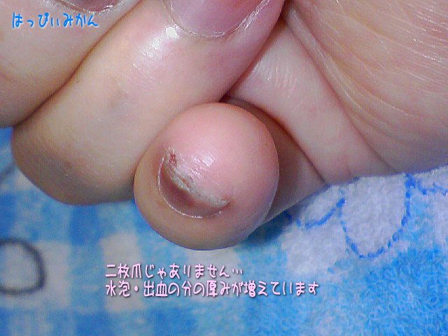 写真をクリックすると大きい写真を見られるようにしていますので試してみてください^^寝てると 爪がドキンドキンと脈打っていますそれだけでは痛くないのだけど…皿洗いをするのに綿手とゴム手をはめるときに綿手に指が入っていく感触がゾワゾワ…その上にゴム手をはめるのにゴム手の指の股で方向を探る?時にゾワゾワ…両手で4本以上の指がこの状態になったら皿洗いなんて絶対出来ませんねぇ…皿を落とすとかいう問題じゃなくて何か触るたびに ひぃ! って言いながら飛び上がっちゃう激痛じゃないんだけど とにかく気色悪い