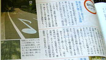 4月14日、くすさんに和歌山を見学させてもらった時に行った「メロディーロード」が7月のJFメイトに載っていた。なんだかメチャクチャ嬉しくて写真に撮った。紀美野町の子供たちに、いくつかの候補の中から選んでもらったそうだ。「見上げてごらん~夜の星」が、車が通るたびに聞けるのだ。くすさんの日記へ!全国に三カ所だそうだ。ひとつは北海道だったと思うけどなあ~?